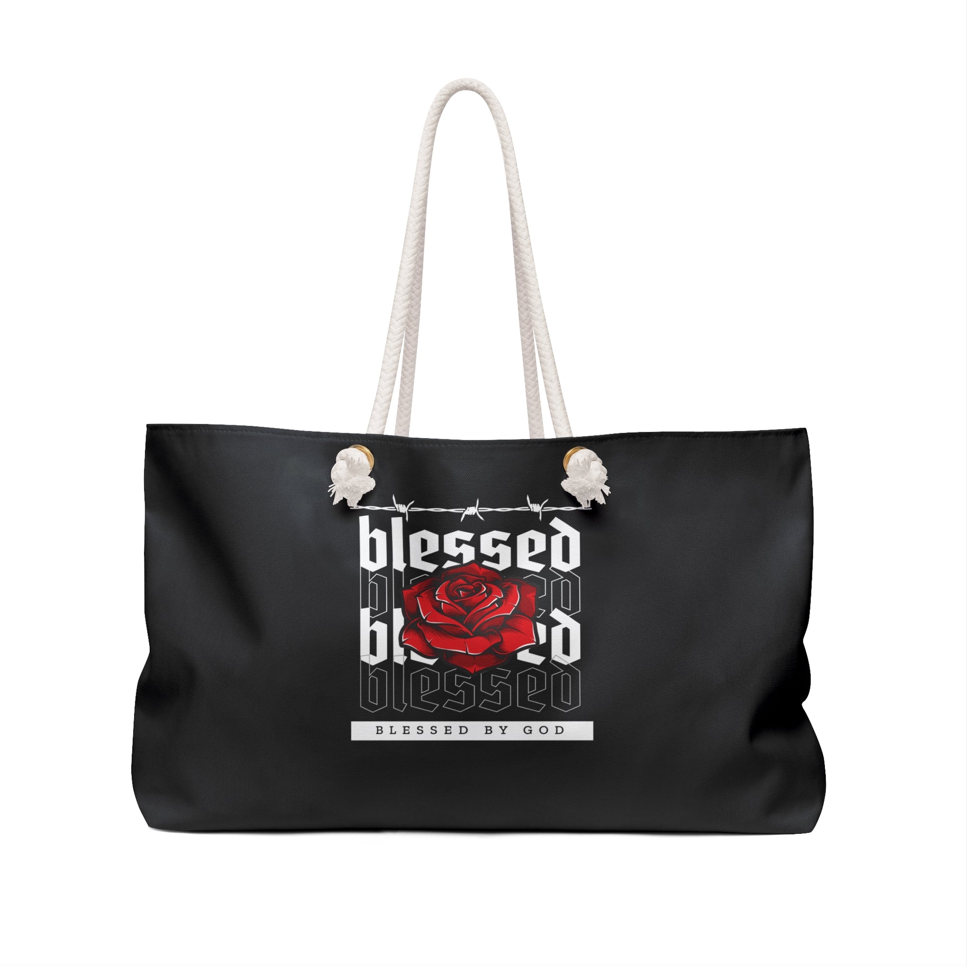 Introducing our stylish Weekender Bag, perfect for your spontaneous getaways and daily adventures. This eye-catching bag features a striking design with a bold rose and uplifting message, effortlessly blending functionality with flair. Designed for the modern traveler, it sits beautifully alongside your favorite outfits, whether you're headed to the beach, a gym session, or a cozy weekend retreat. Ideal for anyone who cherishes inspiring words and loves to express their beliefs, this bag makes a thoughtful gift for friends or family members celebrating milestones, graduations, or spiritual events. Its practicality means it can be used for everyday errands or special occasions like birthdays and holidays. Elevate your travel game with this statement piece that’s sure to bring joy and blessings wherever you go.