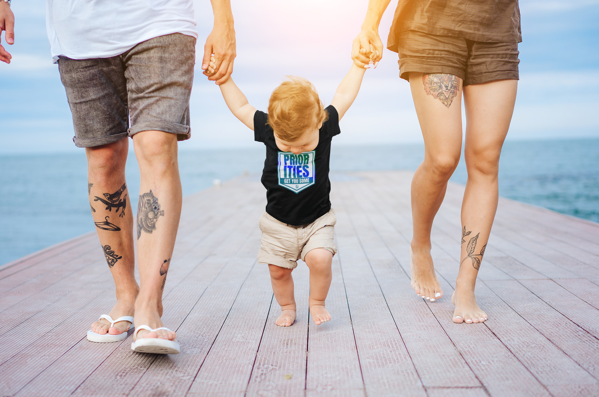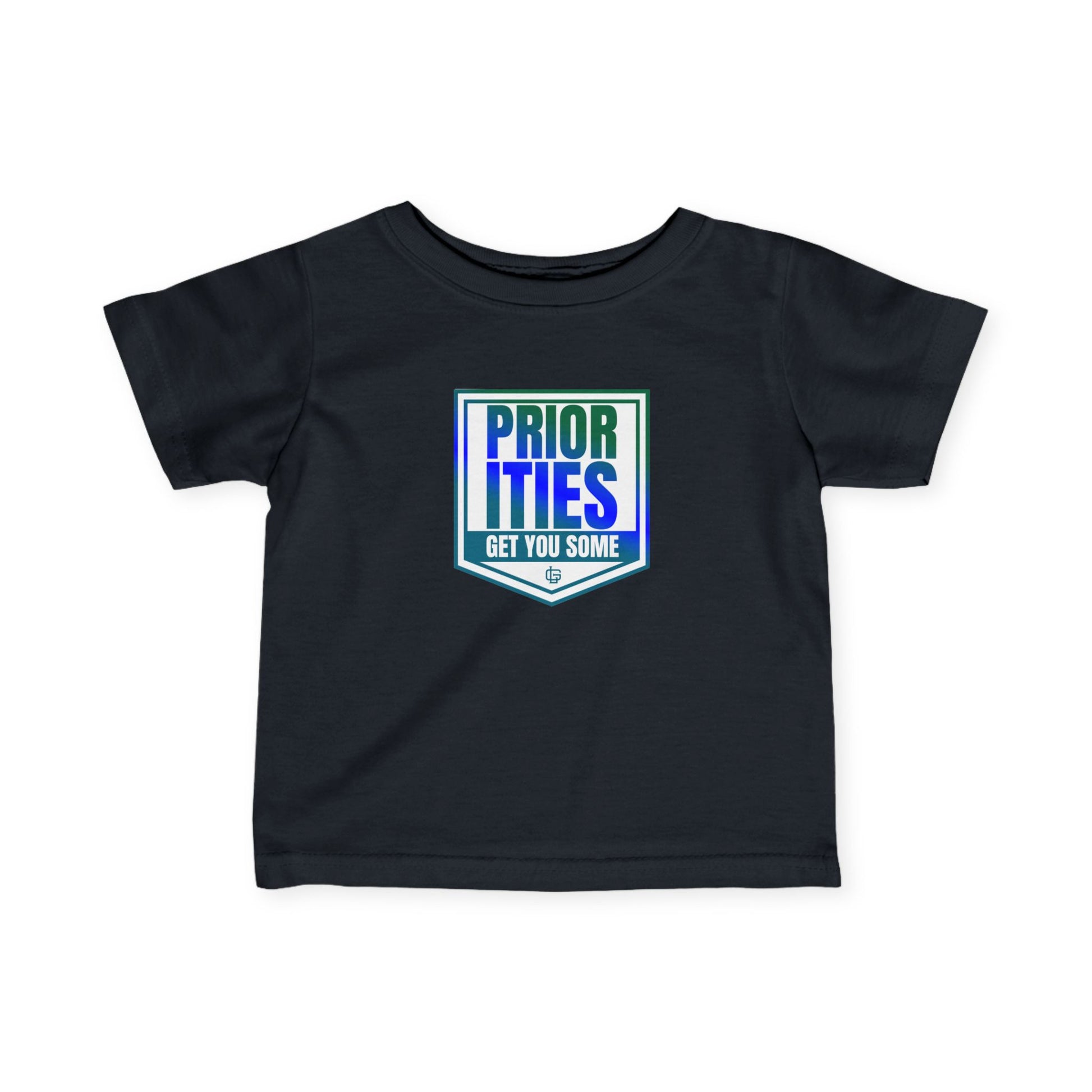 Blue, white and green Priorities, Get You Some Infant Tee for 6 months to 24 months old. This adorable tee gives off a playful and fun vibe, perfect for little ones. It can be a great addition to a baby's wardrobe, or a cute gift for baby showers, birthdays, or holidays.